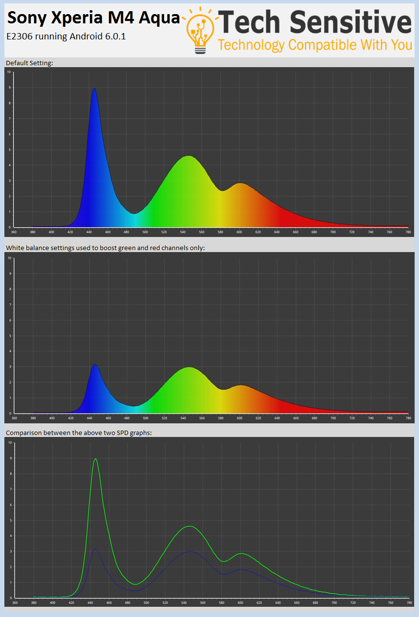 No measurable flicker was detected so users should be confident to select whichever brightness setting they are most comfortable with. Color is where most users will run into trouble using the Sony Xperia M4 Aqua, though this can be improved substantially with some tweaking. If you’re not satisfied with the built-in white balance adjustments available, we recommend exploring third-party apps such as CF.Lumen.