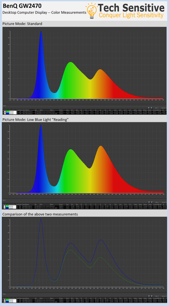Where the GW2470 shines is its relatively aggressive blue-light reduction settings built-in to the display itself. On the standard picture mode selected out-of-the-box we measured a relatively warm CCT of 6156K, where the standard is 6500K and most monitors break 7000K resulting in quite a blue appearance. Activating the low blue light reading mode built into the display brings the CCT down to 4621K, making it a display likely to be tolerated by those most sensitive.
