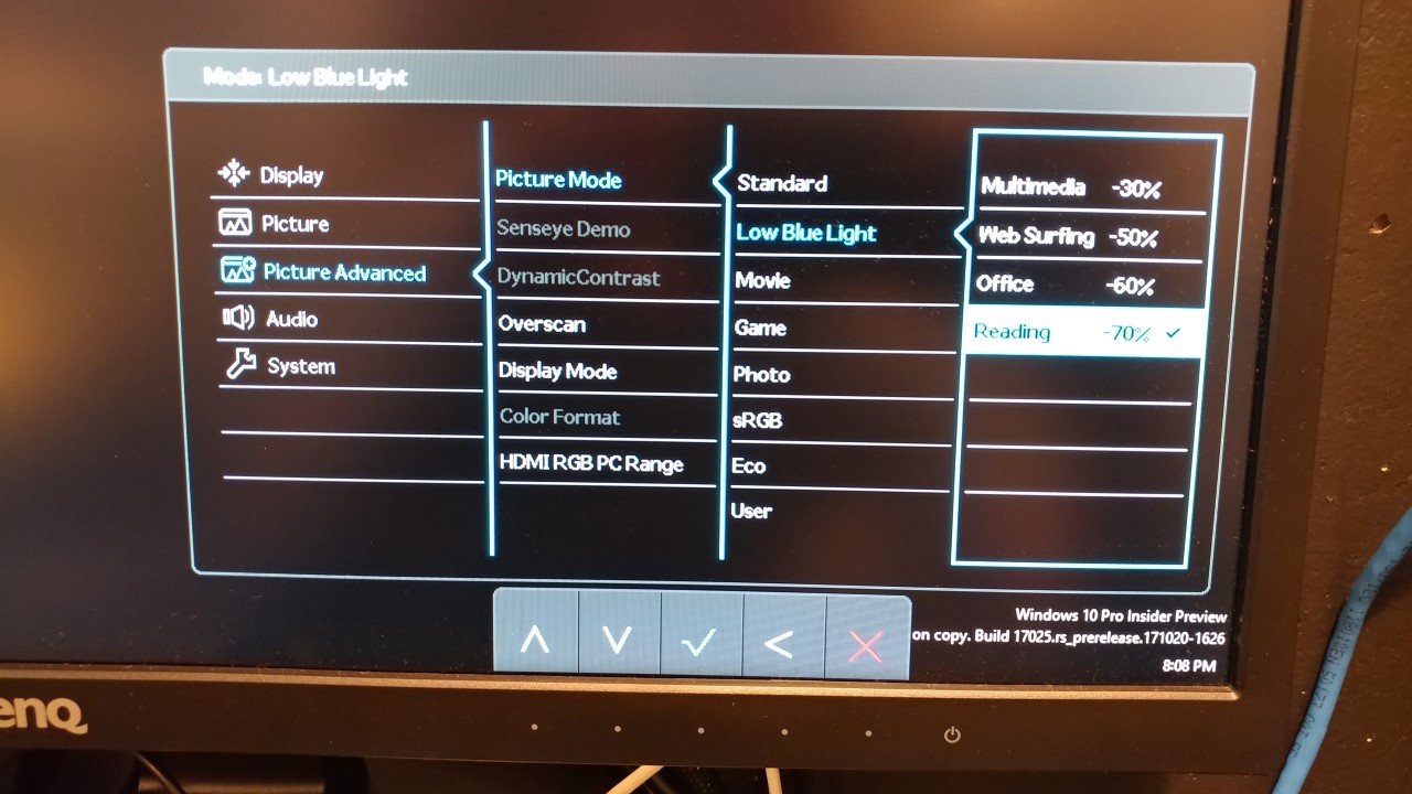 To access the maximum blue light reduction mode built into this display, select Picture Advanced > Picture Mode > Low Blue Light > Reading -70%.