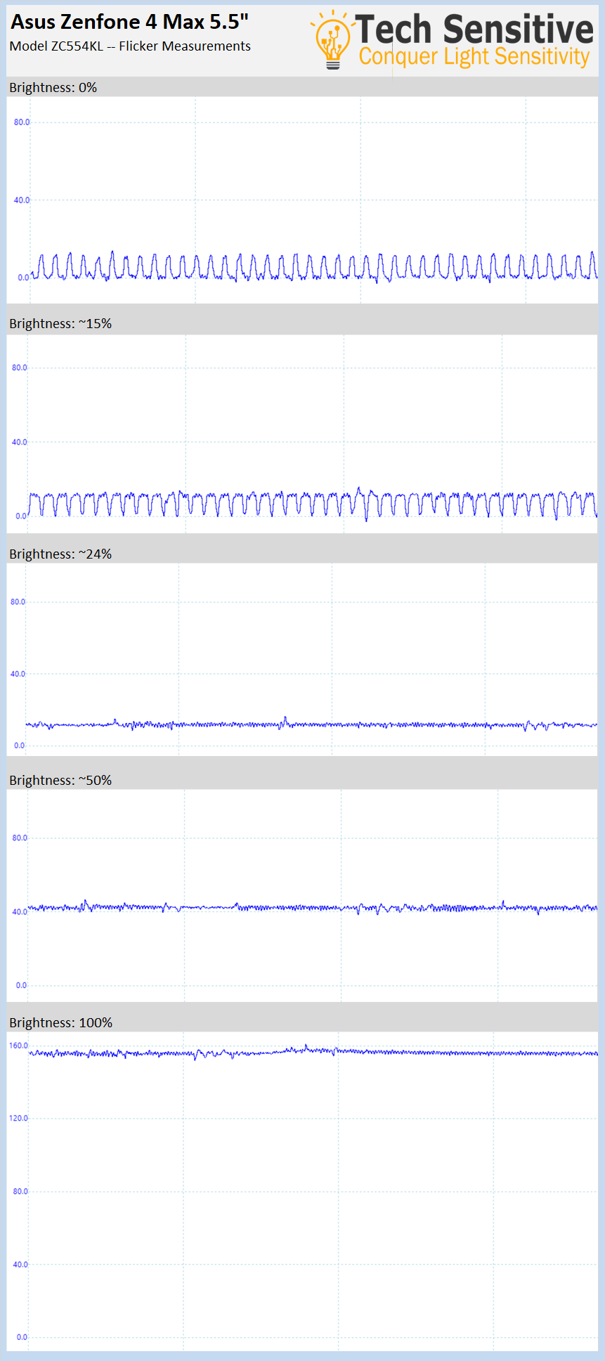 With this combination you’ll be able to avoid all measurable flicker while using the Zenfone 4 Max at any desired brightness level.