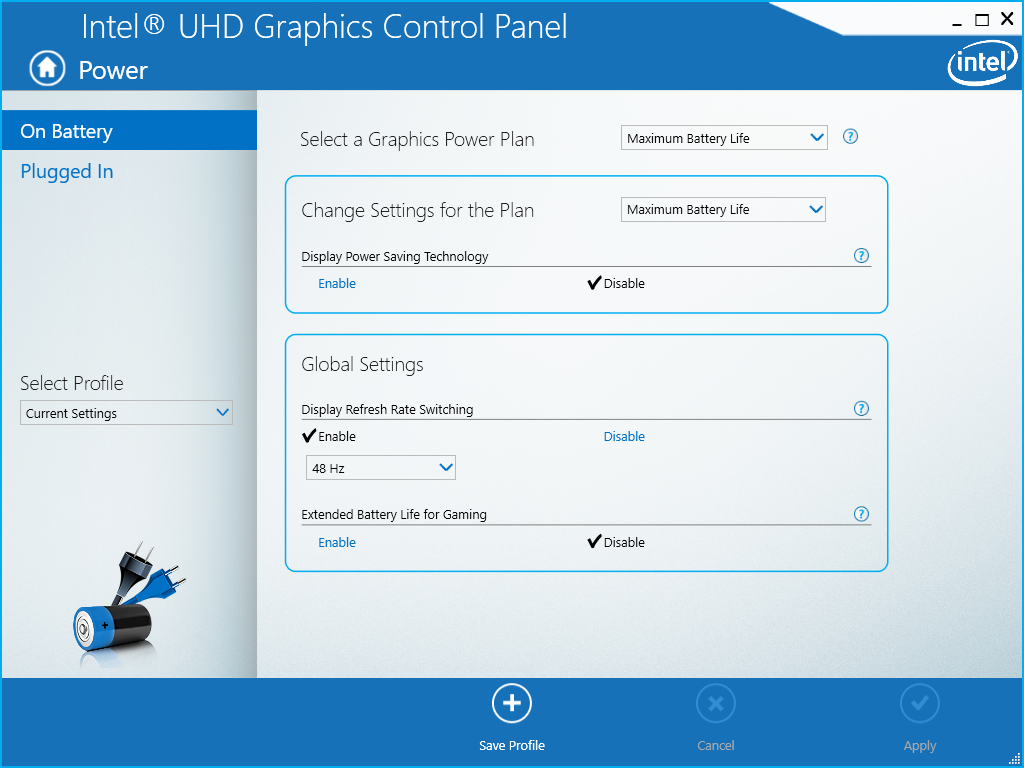 The display settings out-of-the-box, as shipped by Lenovo, are nothing short of awful. Colors look terribly washed out, leading to a cooler, more blue appearance that some may find harder to tolerate. Furthermore the display brightness continually adjusts based on how light or dark the image displayed is, by noticeable and annoying increments. In other words, when switching to a dark image on screen you will notice the screen slowly becoming darker and when switching to a white image the screen will begin to brighten on it’s own. The culprit is the default color and power saving settings utilized by the Intel Graphics driver.